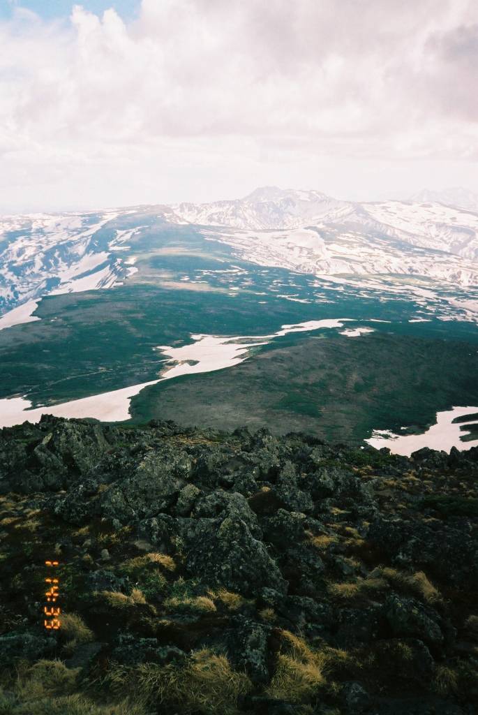上に近づくにつれて、ガスが濃くなってきたが、ピークについてしばらくすると、ぱっと雲が切れ一気に視界が開ける。みな歓声を上げる。後旭にはまだかなり雪渓が残っていたので、ウレタンマットを出して、尻滑りをして一気に下る。しぶきが上がって冷たいが、天気が良くなってきたので気持ちがいい。他のメンバーは後に続かず、ふつうに降りてくる。もったいない。