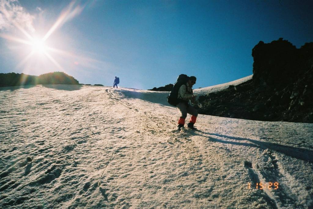 北海岳から白雲岳へは、雪渓をつめる。かなざわは初の雪渓歩きということで、一応形だけ滑落停止の方法などを教える。白雲台地の幻の湖はもうなくなっていた。今年の雪解けは少々早いようだ。台地にザックを置きピークへ。ピークに着き、みな歓声を上げる。大雪山系がぐるり一望できる。やはりこのピークはいつ来ても気持ちがいい。目標のトムラウシ山が遠くに見える。