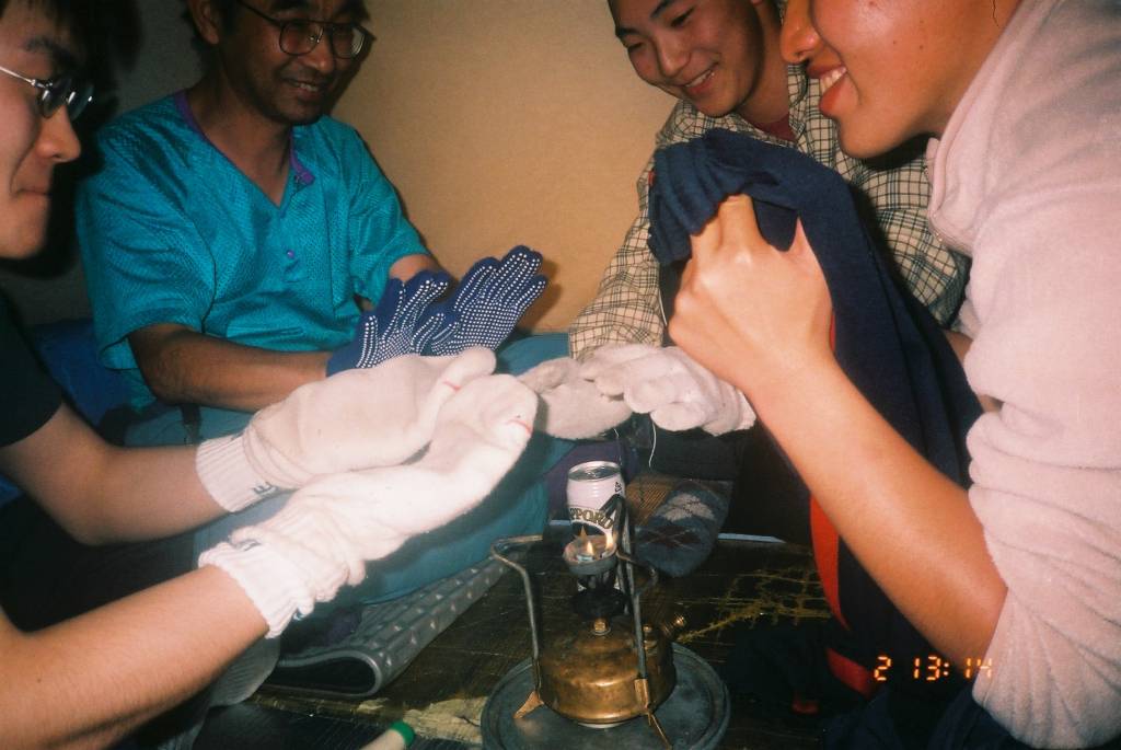 ゴアの雨具を来ていたわたしはほとんどドライであったが、他の面々はかなり濡れ濡れのようだった。エスケープして正解だったようだ。テント内でスベアを焚くと、生ガスが出て目が痛くなる。どうやらパッキンが死んでいるようだ。先生の持ってきたコンロを使わせてもらう。
