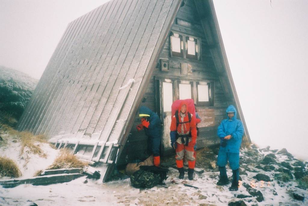 時折霧雨に見舞われ、徐々に強くなっていく。忠別岳を越える頃、風も強くなり横殴りになってくる。ヒサゴ沼まで行く予定であったが、ここはひとまず忠別小屋へ避難することにする。10年前の快適なイメージで避難したが、小屋は入口が壊れ、雪が吹き込み一階は使える状態ではなかった。2階はなんとか泊まれるが、窓から風が吹き込み、床がめくり上がっていた。天候回復を待ったが、回復しそうにないので、小屋の中にテントを張って今日はここに泊まることにする。