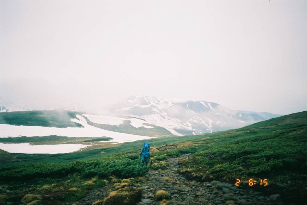 天候の悪化を予測して、早立ちする。出発から霧雨っぽい。高根ヶ原中程で視界が開け、後を振り返ると、旭岳や白雲岳が白く染まっている。どうやら昨夜は雨から雪に変わったようだ。
