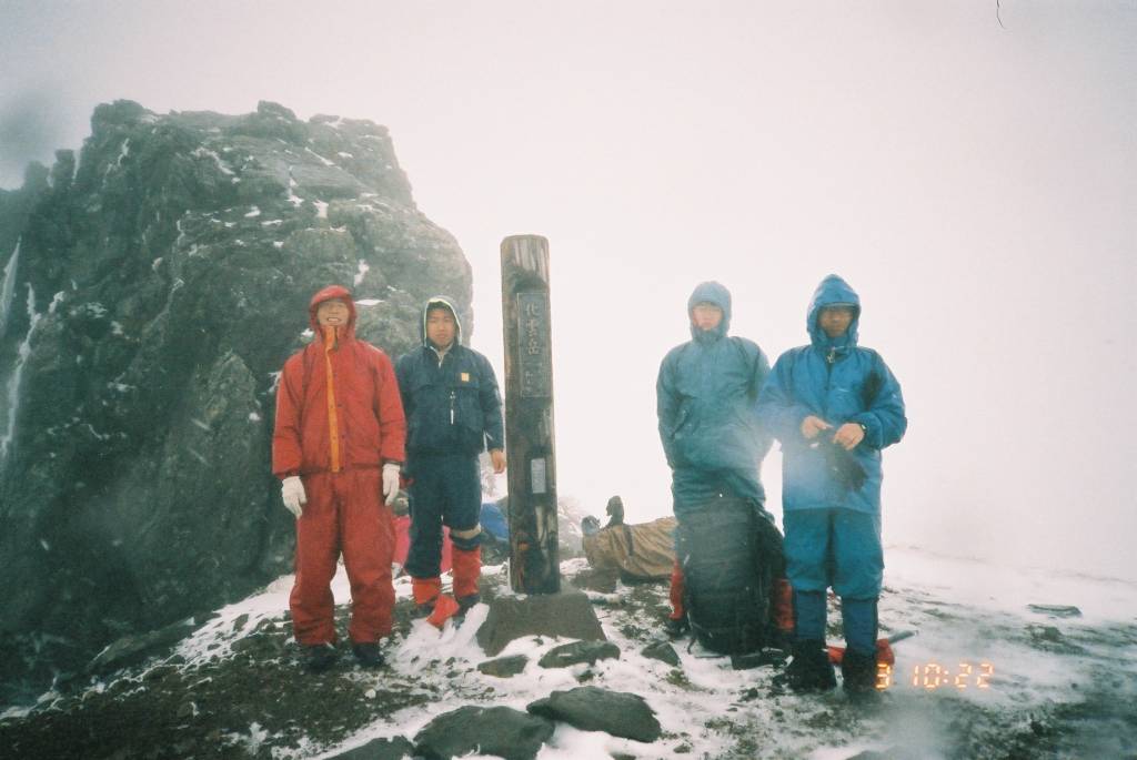 化雲岳のあたりからみぞれになる。休憩すると体が冷える。若い学生達はこの程度では死なないだろうが、いわゆる中高年の先生のことが気がかりだ。遅れがちな先生が追いつくたびに、「大丈夫ですか?」と訪ねるが、「大丈夫、大丈夫」と余裕を見せる。先生の言葉を信じることにする。