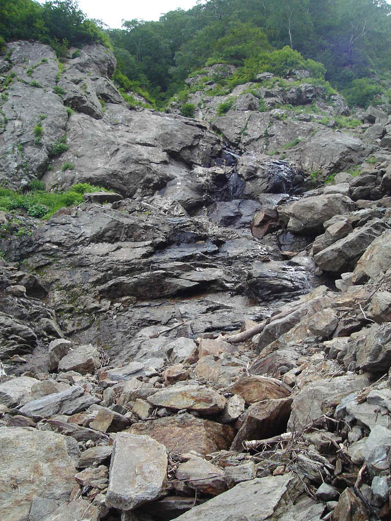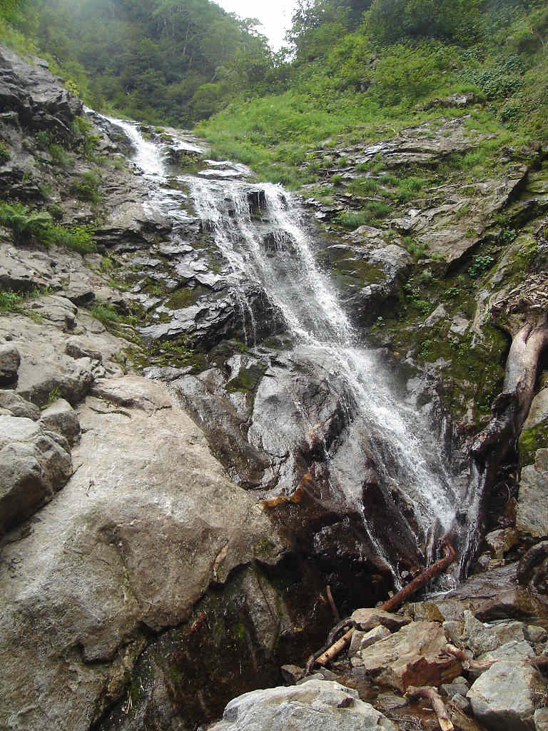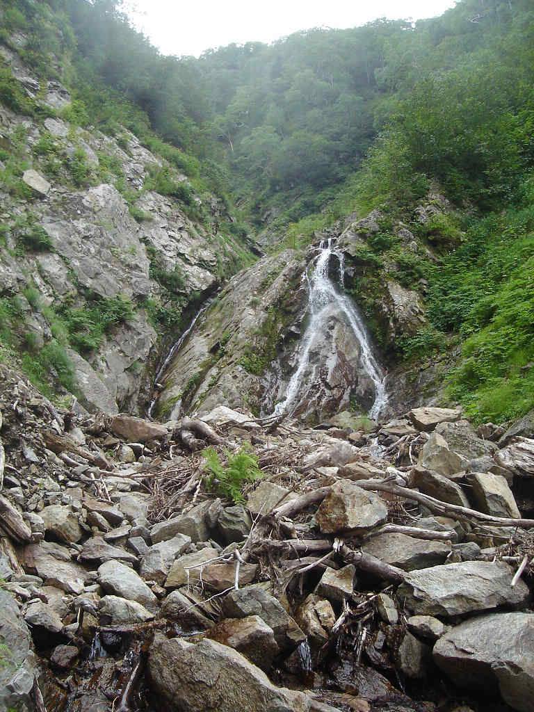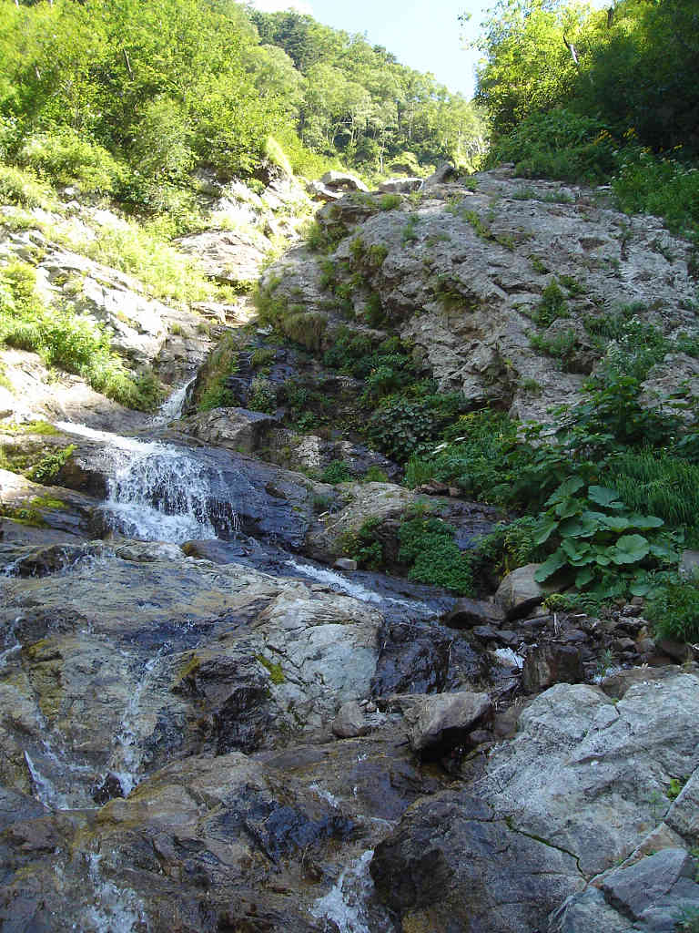 時間はたっぷりあるので、一応釣りをしみることにする。今回は釣り竿を忘れたので、枯れ枝に釣り糸をつけて、いつものようにカワゲラをえさにして垂らすが、あたりはない。少なくともカジカはいるのだろうが、イワナが居るような気配はない。カジカもカワゲラで釣れるものだろうか?釣り竿もないし、天場をちょっとでも離れるとゴルジュ帯なので、天場から離れてイワナを探す気にもなれず、結局この日は何もつれずに終了。