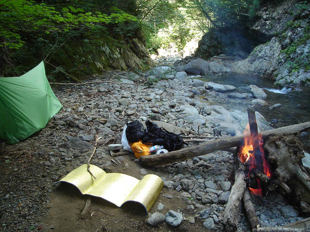 三ノ沢出合付近に天場があるかどうか一番懸念していたが、それなりに快適そうな天場があって良かった。しかし、空はすばらしく晴れているが、北面の沢で周囲の岸は高く、全く日が当たらず寒い。あまり流木が溜まるような場所ではないが、おそらく何年もここで泊まった人は居ないのだろう、薪はわりと豊富だ。周辺の流木をかき集め、焚き火をつける。
