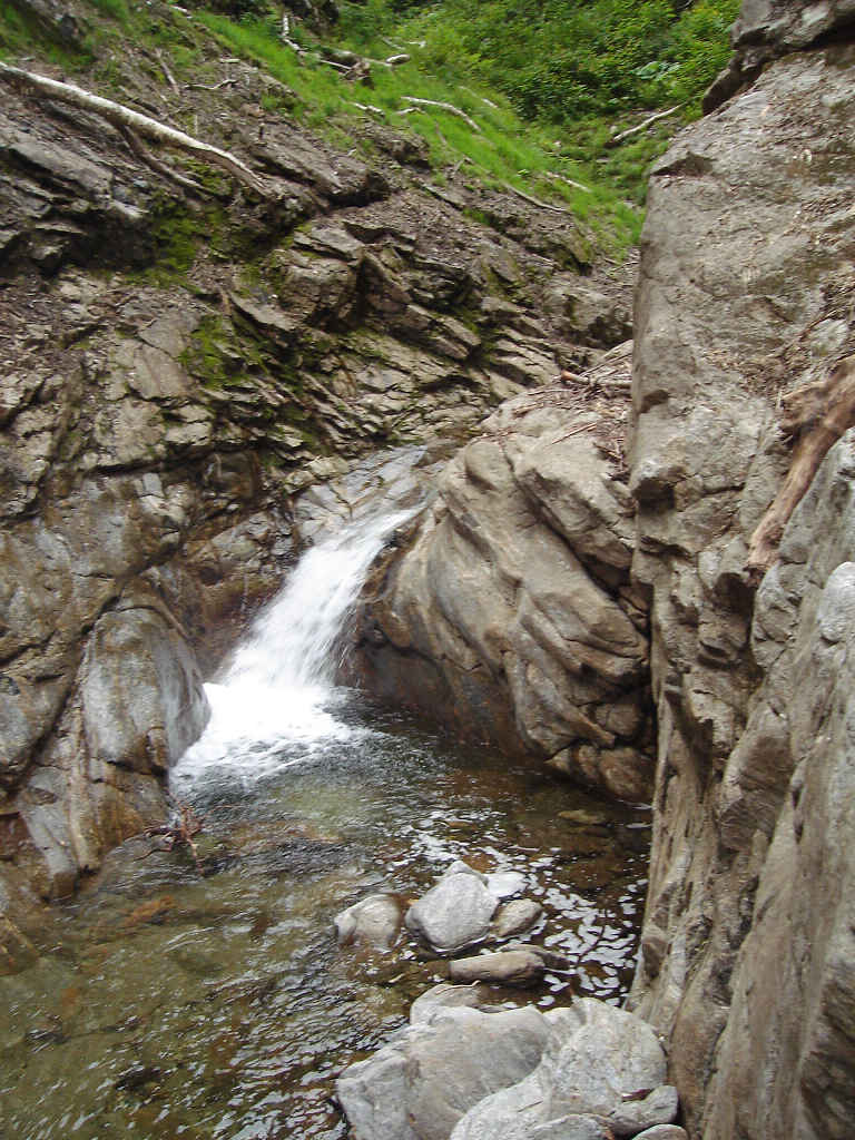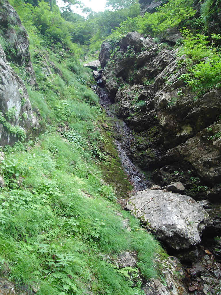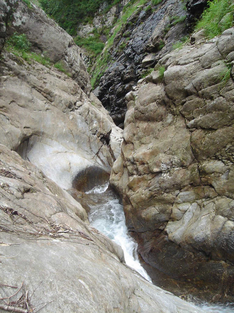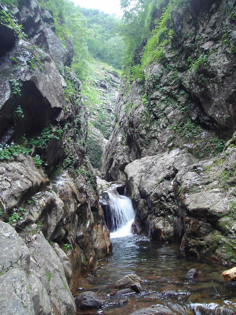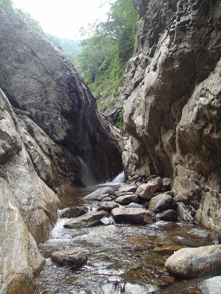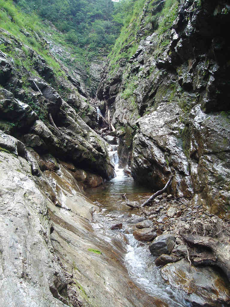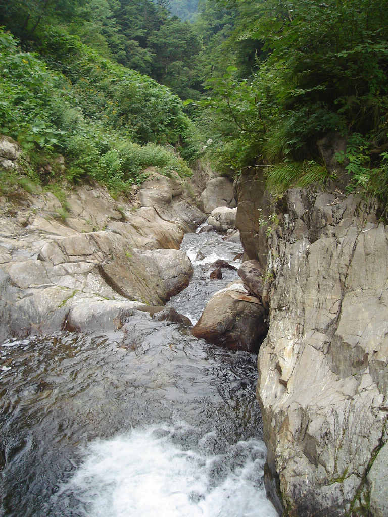 沢が左に曲がると狭いゴルジュの中に釜を持ったツルツルの滝が続いている。先ほどの滝で、すっかり体力も気力も使い果たして、全くやる気がわいてこない。右岸のテラスが使えそうなので、高巻くことにする。中には 3~4 の釜持ちの滝があるようである。それなりの泳力と体力がなければ内部突破はしていられないだろう。