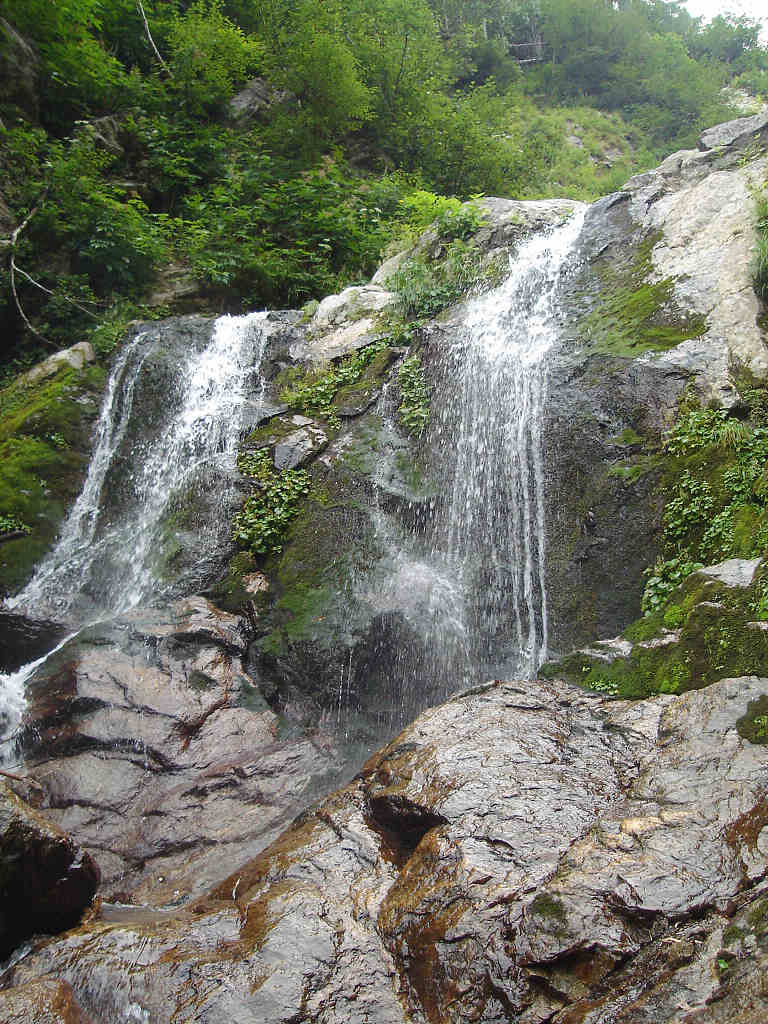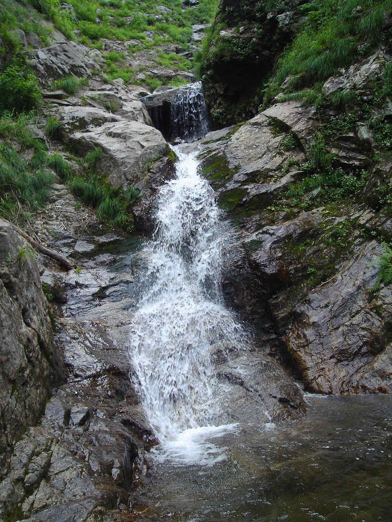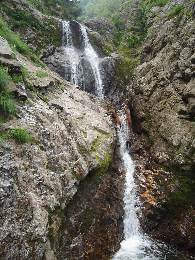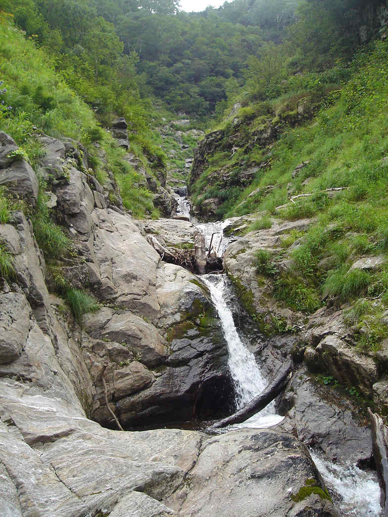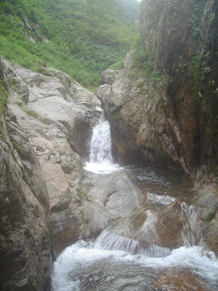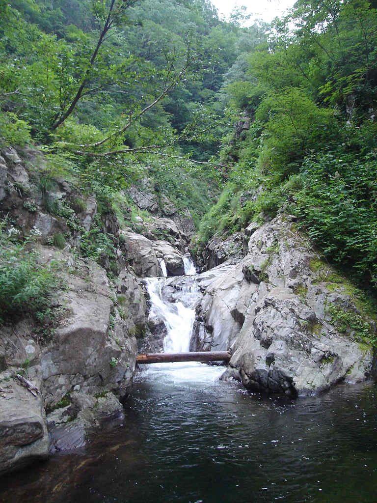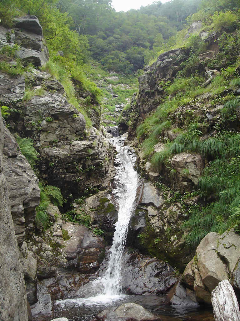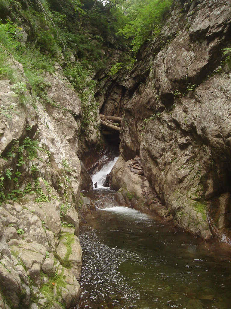 沢が左に曲がると狭いゴルジュの中に釜を持ったツルツルの滝が続いている。先ほどの滝で、すっかり体力も気力も使い果たして、全くやる気がわいてこない。右岸のテラスが使えそうなので、高巻くことにする。中には 3~4 の釜持ちの滝があるようである。それなりの泳力と体力がなければ内部突破はしていられないだろう。
