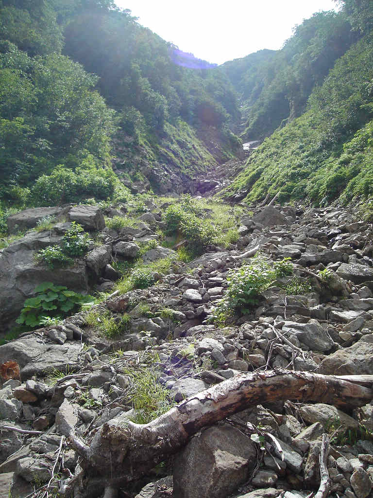 渓相は一変し、果てしないガレが続いている。このあたりはやや傾斜も緩くなっており、この沢唯一のビバークポイントとなるだろう。ガレを詰めていくと、雪渓が残っており、中には嫌らしいスノーブリッヂもある。下を行くと早そうだが、なんか嫌な感じがするので、上に上がり脇を巻いていく。更にすさまじいガレを詰めていくと、 Co1400 三股となり、進む左股は滝となって合流している。