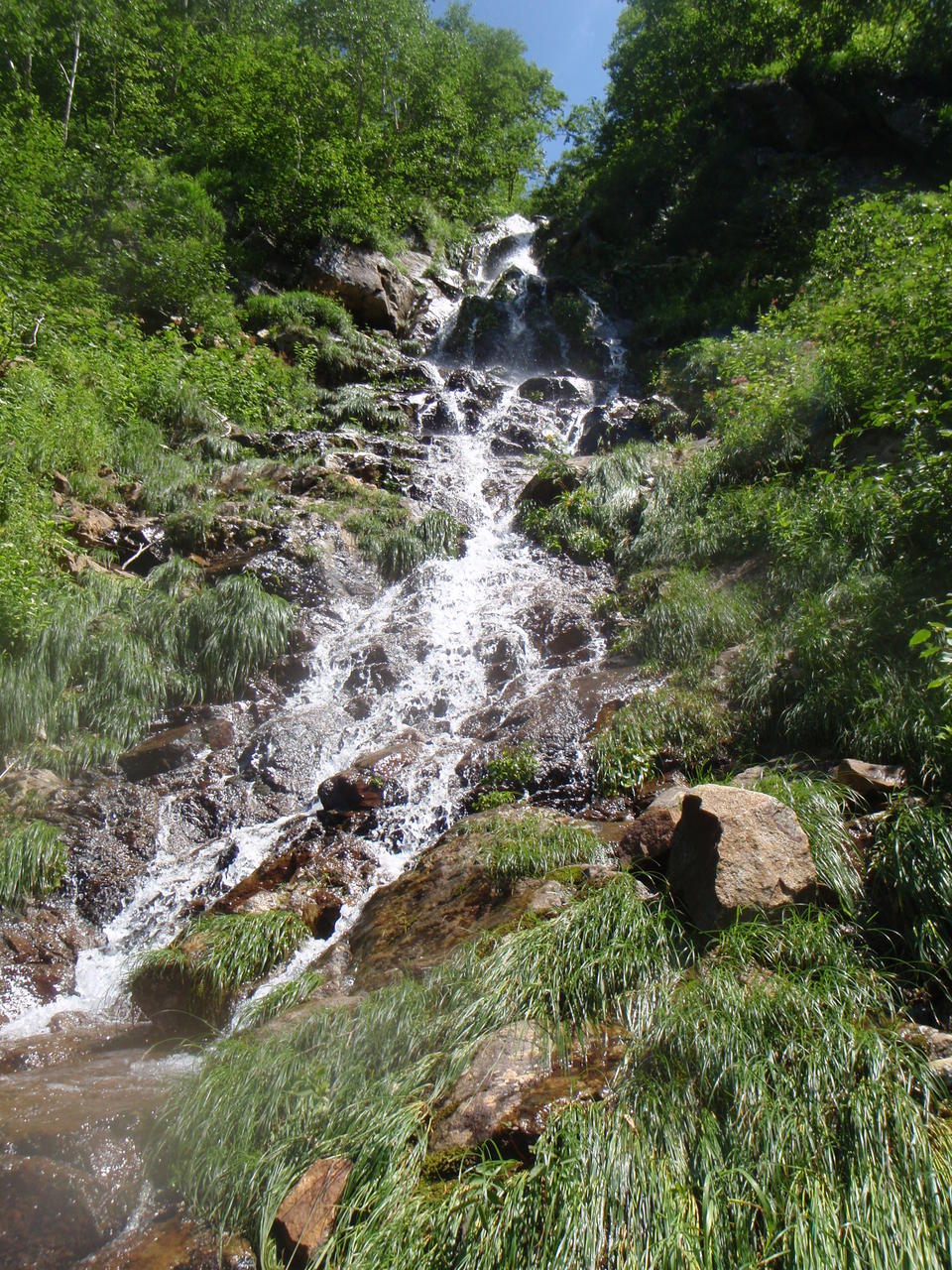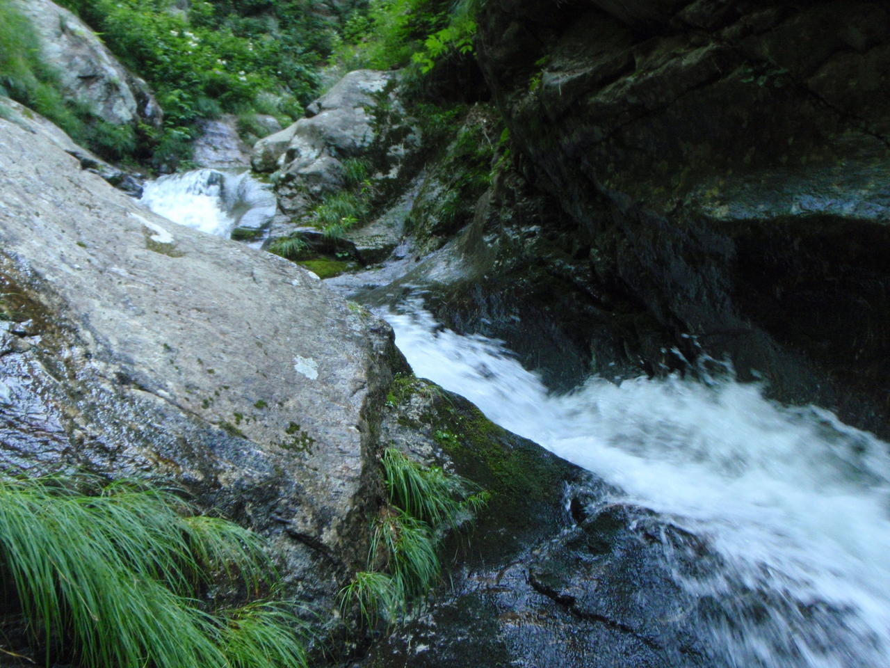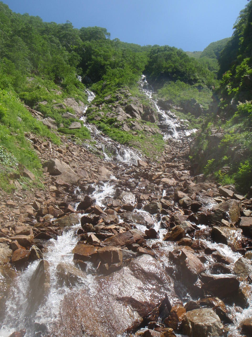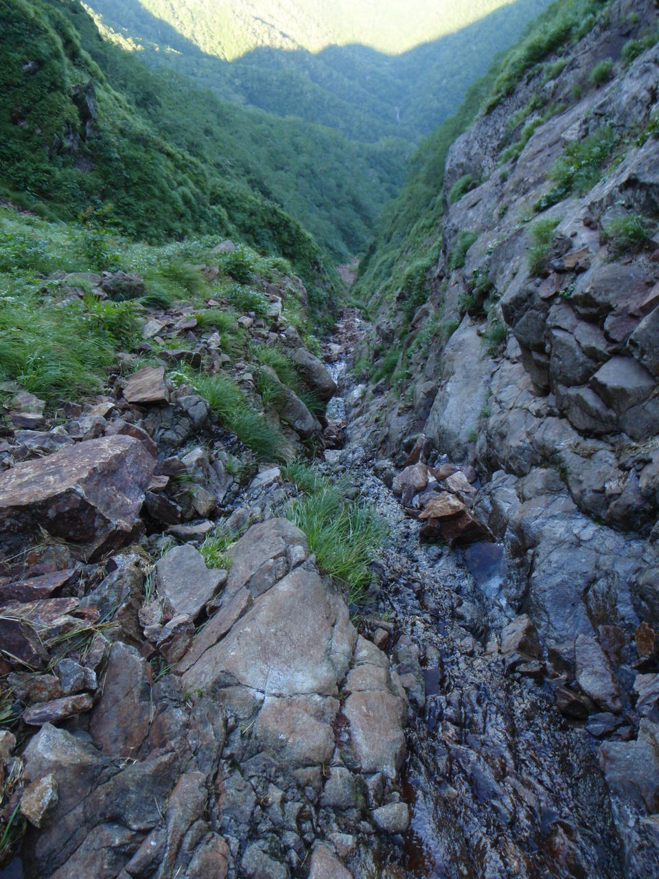 急傾斜の草付きを滑り降りると、すぐにガレの沢となる。不安定なガレが超鬱陶しい。インゼルの所は岩が出て水が出ているので、左岸から乗っ越す。その先は滝も出始めるようなので、ここで靴を履き替えた。