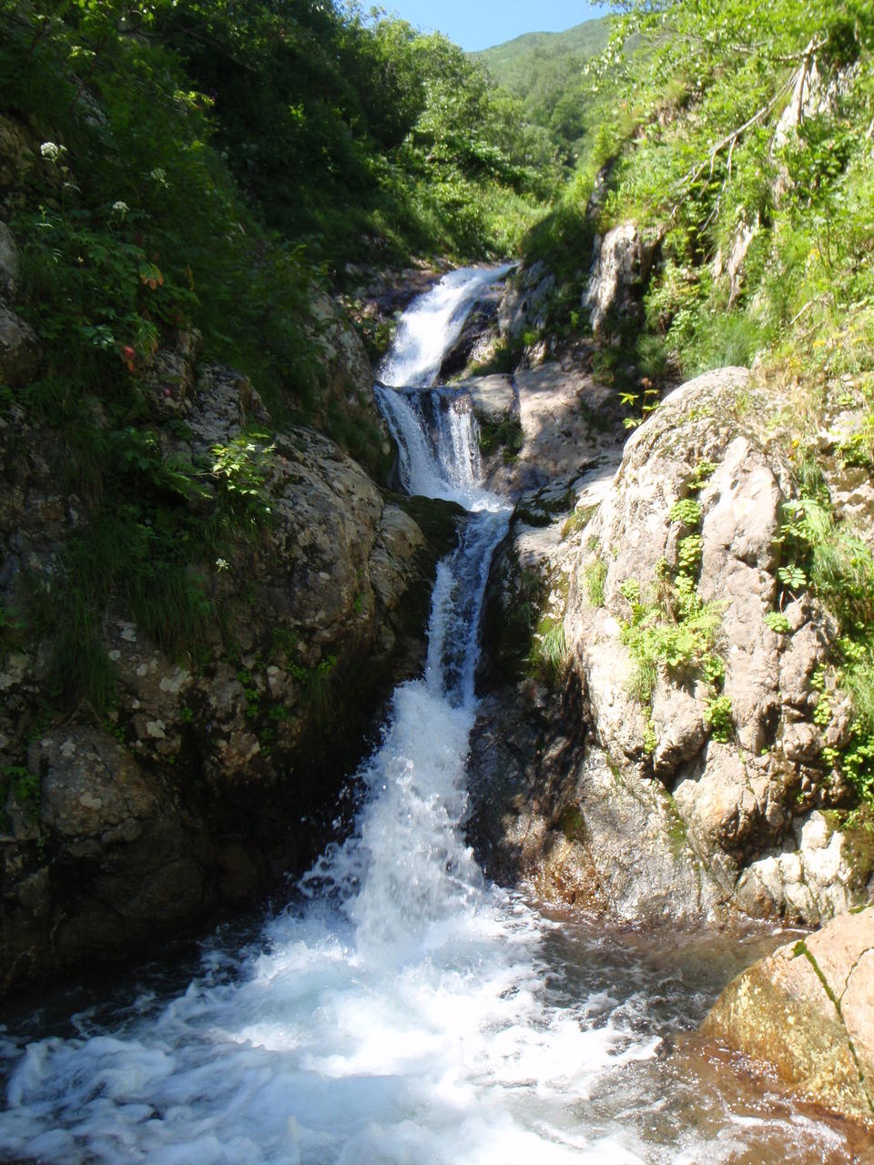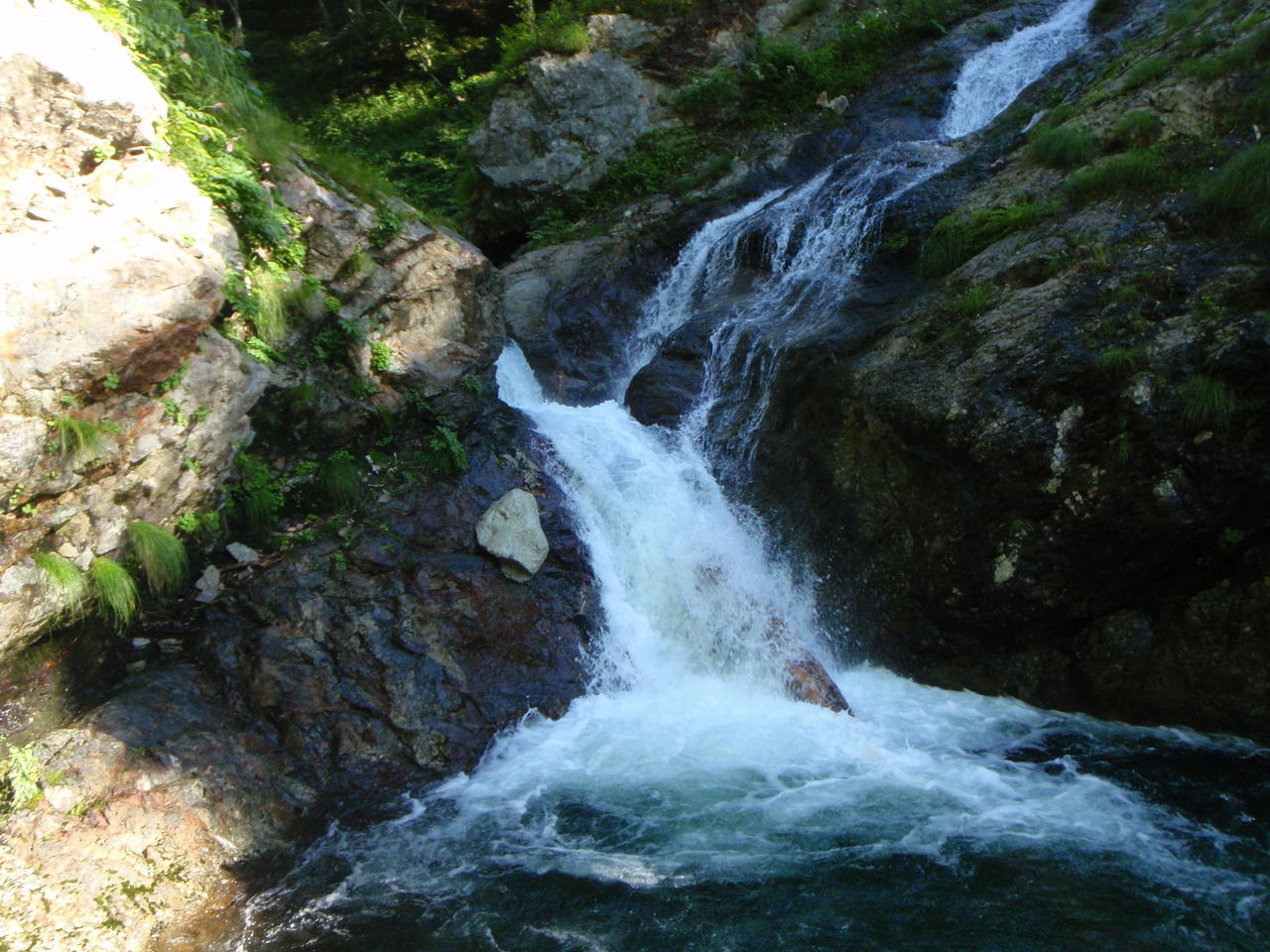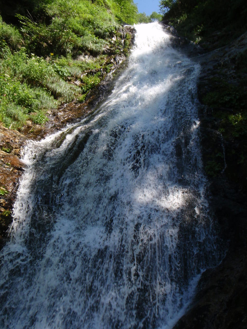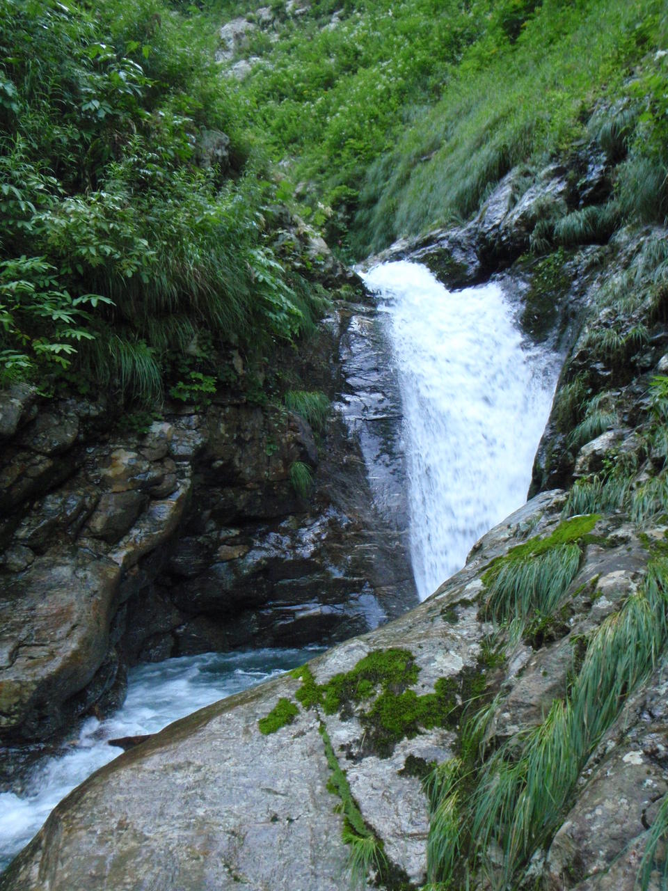 急傾斜の草付きを滑り降りると、すぐにガレの沢となる。不安定なガレが超鬱陶しい。インゼルの所は岩が出て水が出ているので、左岸から乗っ越す。その先は滝も出始めるようなので、ここで靴を履き替えた。