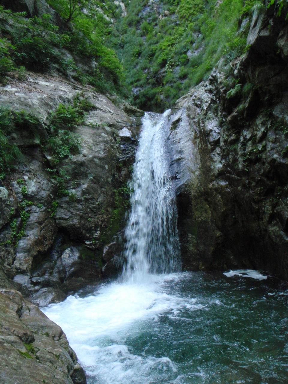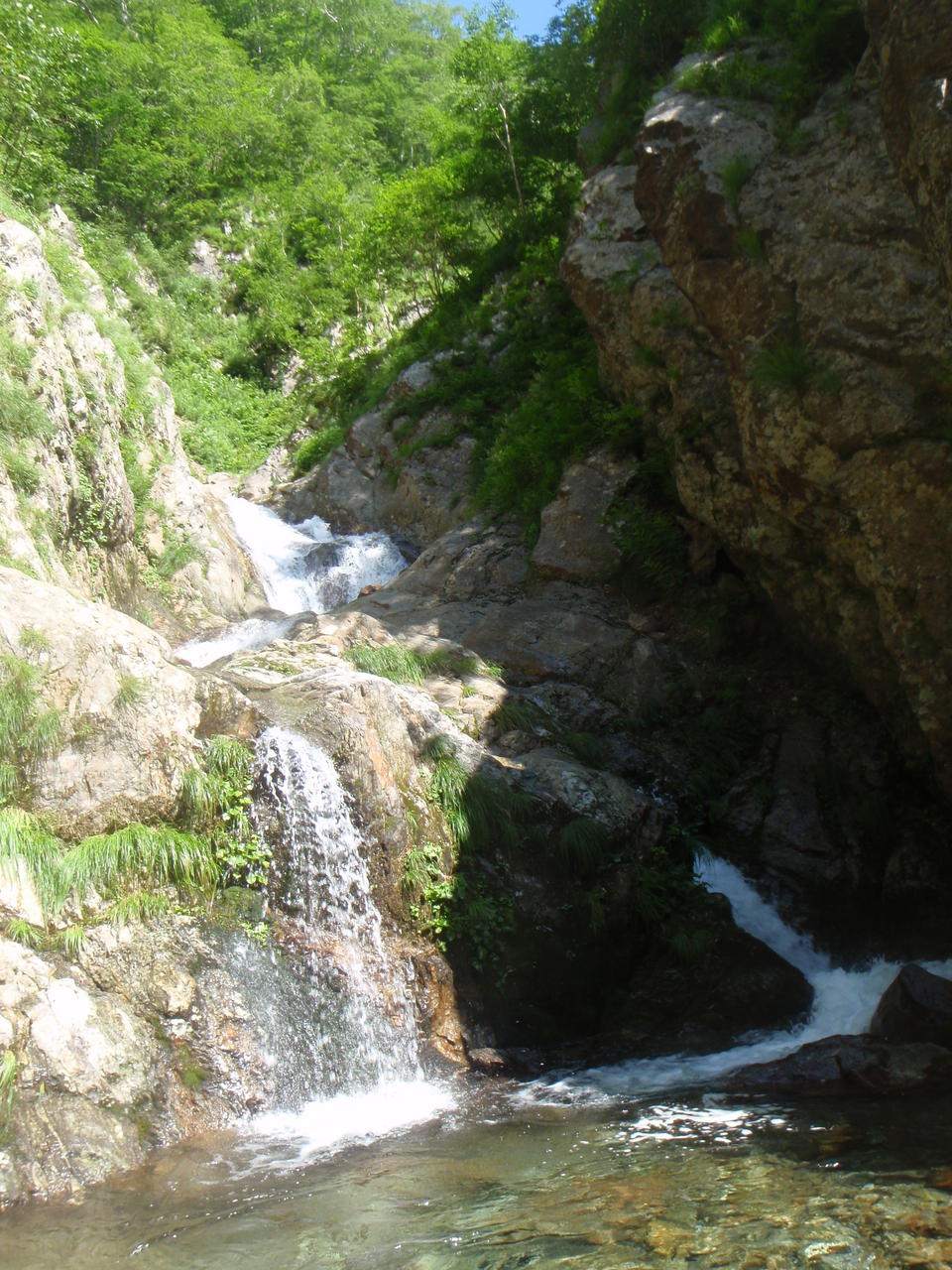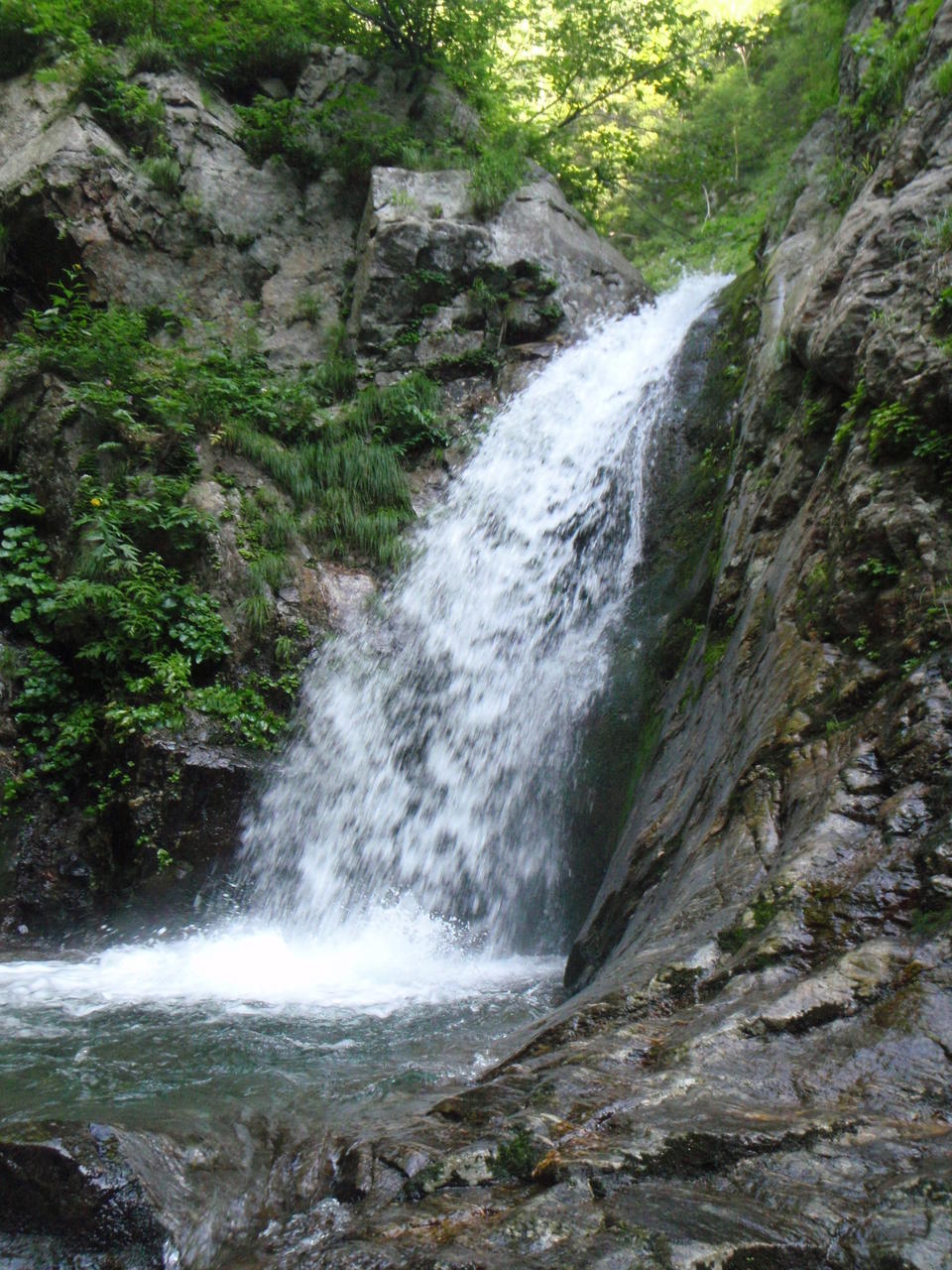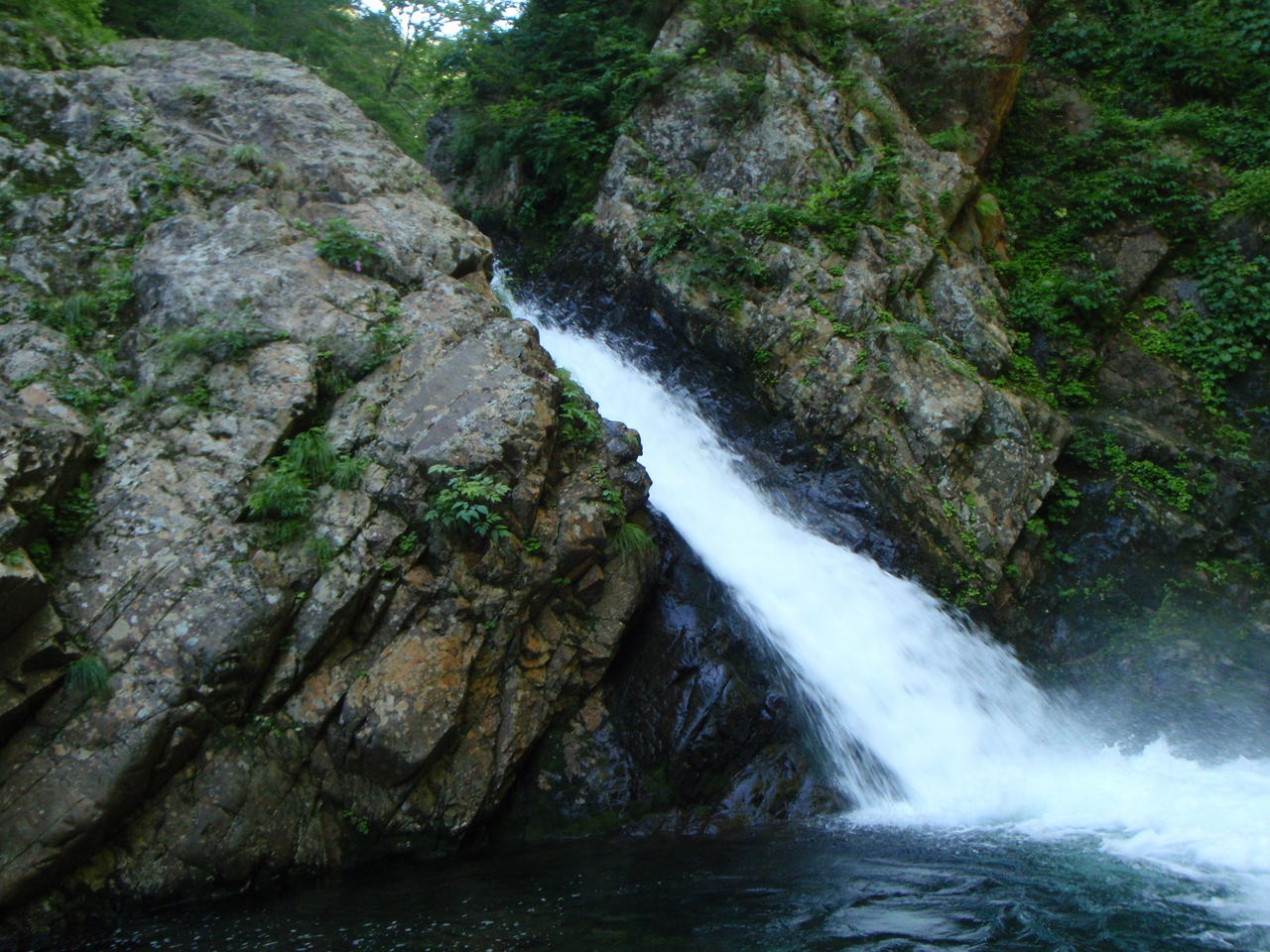 この沢は出合から険悪なゴルジュとなって、手応えのある滝が詰まっている。はじめはS字に屈曲する小さな滝。これは問題ない。続くチョックストンは釜右岸からはい上がる。一度失敗してドボンした。更にチョックを通過し、次の滝は左岸バンドを斜上し、へつって落ち口に出た(Co650)。