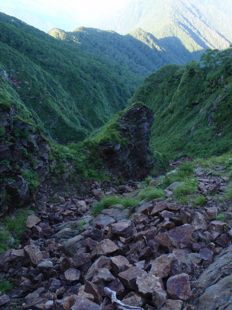 今日も稜線泊まりのつもりだったが、水を補給し損ねたので、沢に下るしかない。テントを回収して南へ向かう。今日二度目の稜線歩きだ。荷物は重いが二度目の方が何故か速かった。