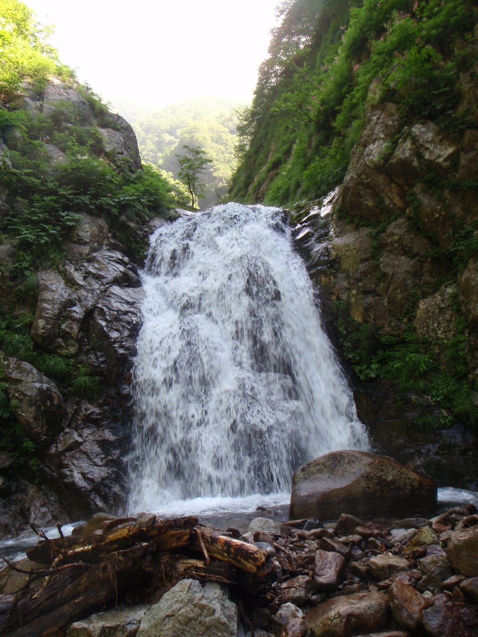 その先は高い函状にガレが詰まっている。地形図では表現出来ていない沢の合流になっているようだ。 Co850 の三段の滝は水量が多く、しぶきがはじけて落ちている。これを直登の選択なのか?躊躇するが、覚悟を決めて右岸水際につっこむ。ばっちり水を浴びながらのシャワークライムだ。確かにホールドはあるが、誰だこんなの登るヤツ。って、オレか。最後は奔流で水流には入れないので外のホールドを求めて水流をまたいで一段目の上に出た。まったく、6年前のオレは狂ってる。二段目はツルツルで取り付けないので、左岸テラスに登って側壁トラバースして小さく巻く。三段目は右岸シャワーで快適に直登した。さらに四,五と小滝が続いているが、問題ない(Co850-900 三段)。