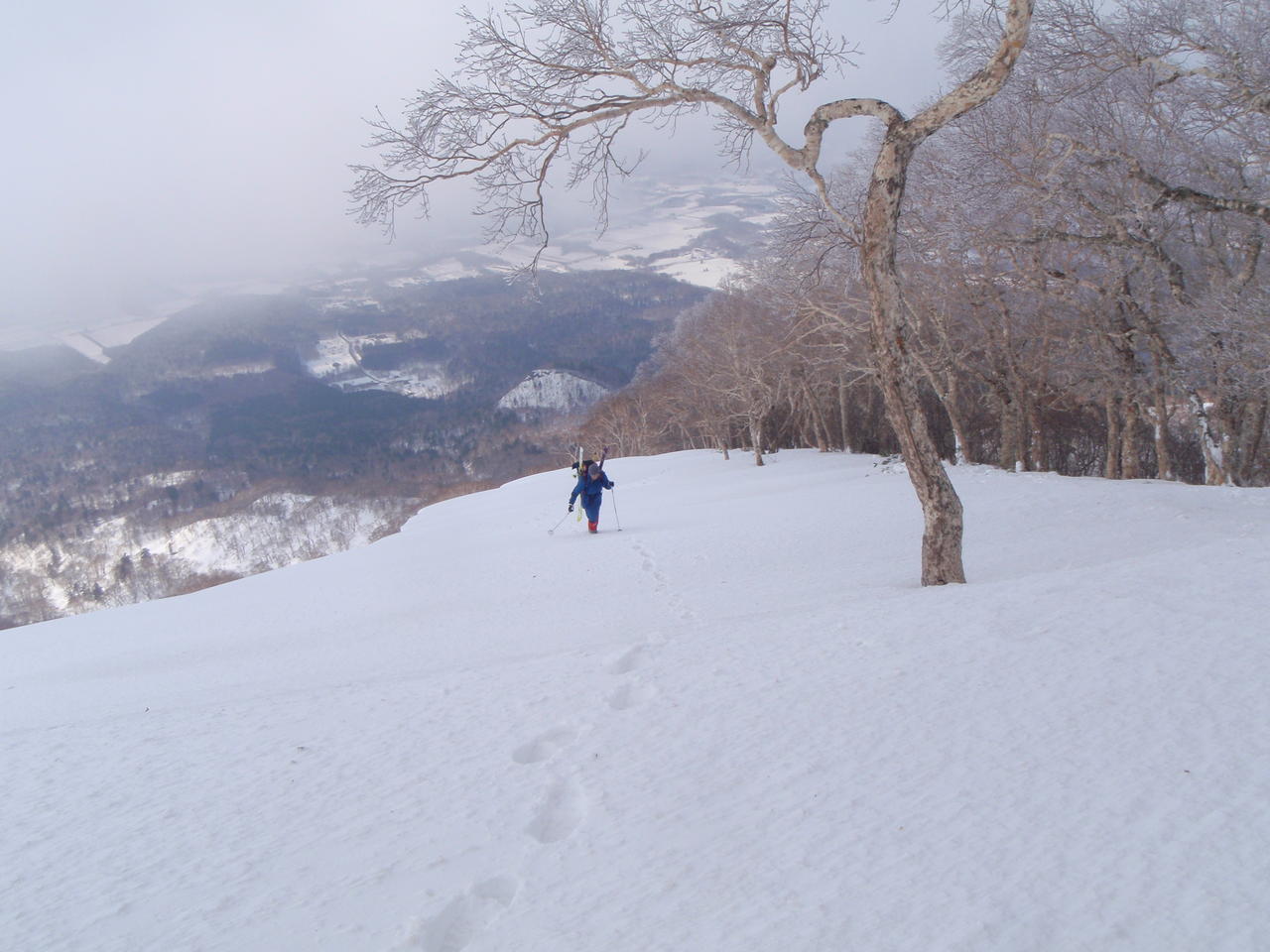今日はデポ旗を忘れたので、ピークは目指さずそのまま下ることにする。ピークに行ってもこの視界ではしょうがない。降り始めるとすぐに、ツボでスキーを担いだ男性2人組が登ってきた。さらに降りるともう少し年配の2人組とすれ違う。この天気なのに意外と登る人はいる物だ。