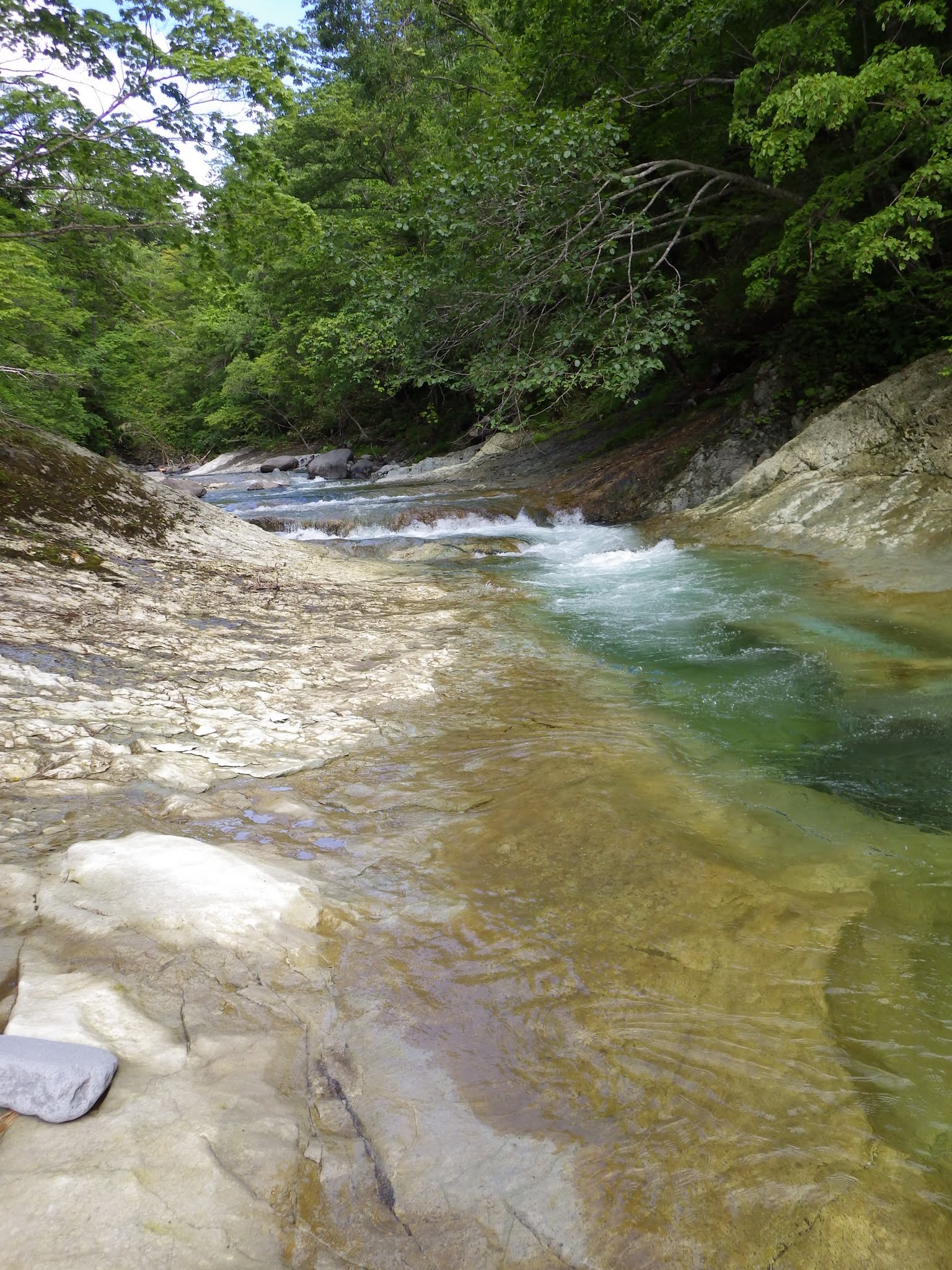 林道を歩いて砥石沢に入る。少し上部も覗いてみたが、何もなさそう。下流もしばらくはブタ。モスグリーンの滑床も思っていたほど綺麗ではなく、ノリが付着して滑る。時期的なものだろうか。橋よりも下流はゴミが散乱して、ドブ川感が否めない。