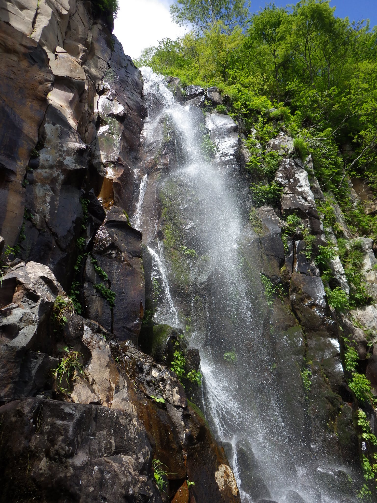 大滝は柱状節理の滝で、大きなクラックが走っているので、ウェットスーツでも着て大きめのカムを駆使すれば登れそうだが、登攀そのものよりも低体温の方がヤバそう。本州の暖かい沢ならやる人も居るかもしれないが。右岸を登ることも出来そうだが、けっこう真新しい崩壊跡なので、浮き石で泣きそう。更に右岸の階段状を登って巻けば簡単に上に上がれそうだが、その上には何もなさそうだし、降りるのが面倒なのでここで引き返す。