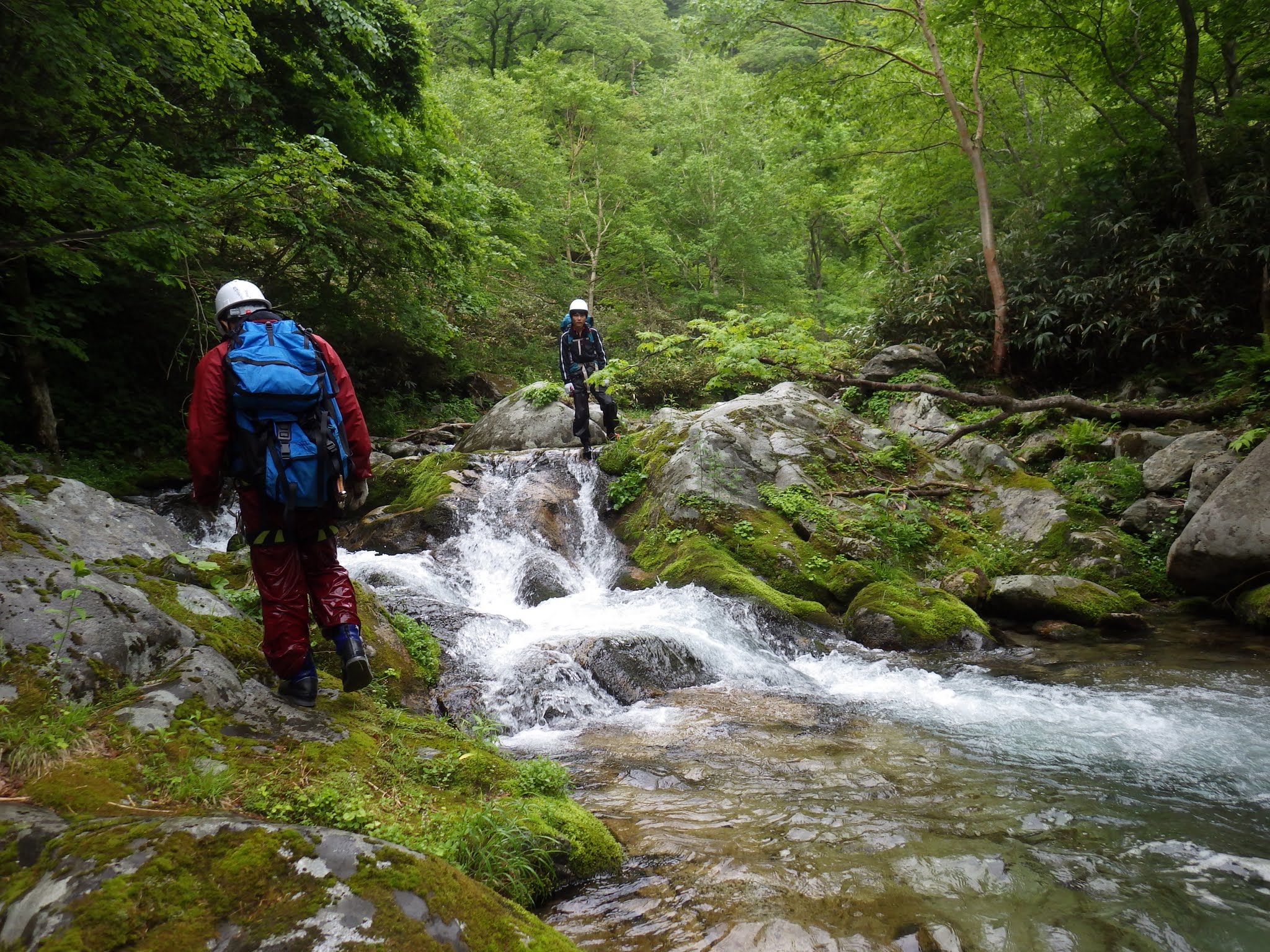 巨岩帯を越えた伏流原は、雪解け水が流れていた。ここを過ぎて上部ゴルジュ帯にさしかかると、雪渓が沢を埋め、ガスも濃くなってきたので引き返すことにした。