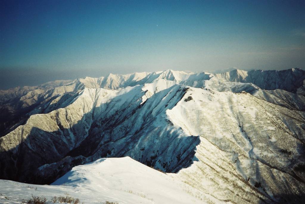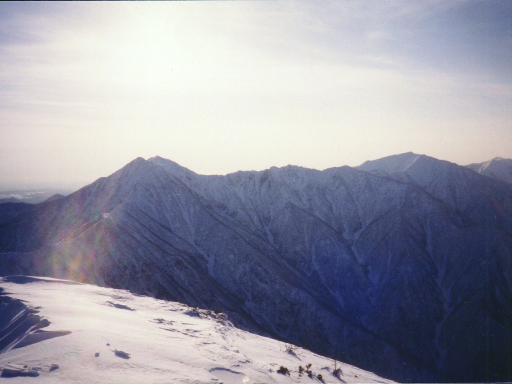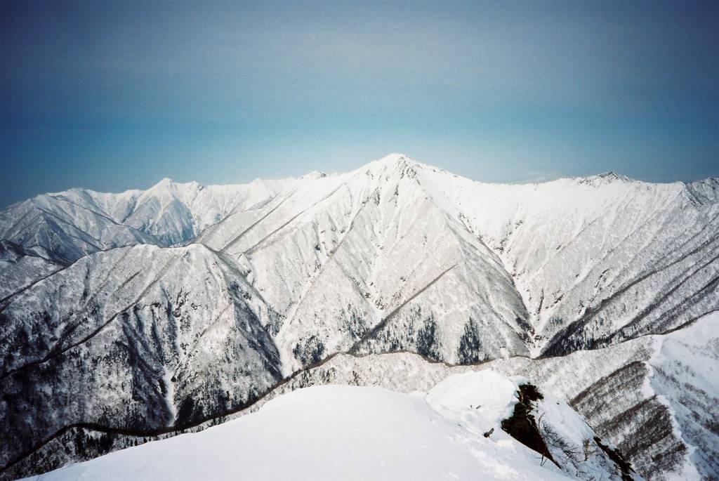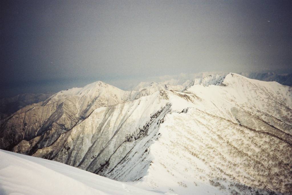 雪が締まり、アイゼンが効いて快調に進む。ピッケルは使わず、ストックを利用する。風も弱く、予想以上のペースで進む。十勝岳ピークからこれまで歩いてきた稜線を望む。北・中日高の山々が遙か彼方に見える。反対側には、最後の山楽古岳と眼下には楽古山荘が見える。左を見ると、すぐ近くに太平洋が広がっている。終わりは近い。