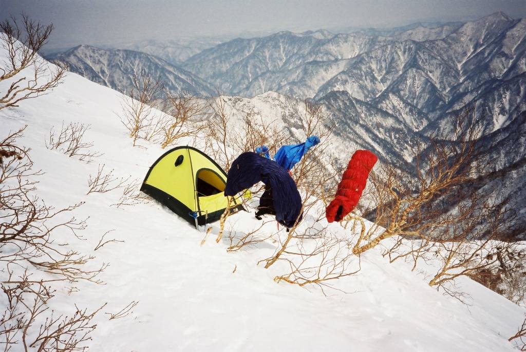 夜半から風を伴って雪が降り出す。尾根陰に泊まったはずなのにものすごい横風にあおられる。どうやら、発達した低気圧の接近で、逆風、つまり南東風が谷から吹き上げているようだ。山側には吹き上げられた雪が吹きだまり、テントが埋まり、谷側からはすごい風であおられ、テント内の空間がなくなってくる。やむを得ず、3時に除雪をする。