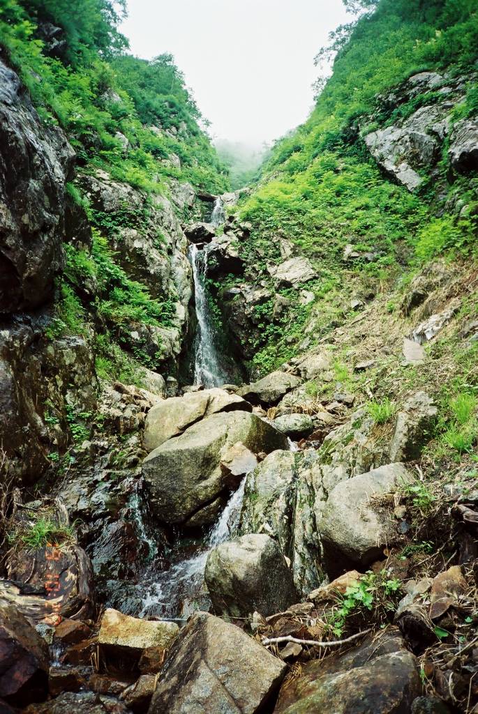 今回は林道を使い、河原はショートカットする。 Co940 の滝はもったいないが、サクッと右岸を巻く。続く 40m の滝は前回同様直登する(Co970-1010)。今回はそこそこの天候で、前回よりも楽にホールドを見つける。念のためかんにはザイルを出してやる。