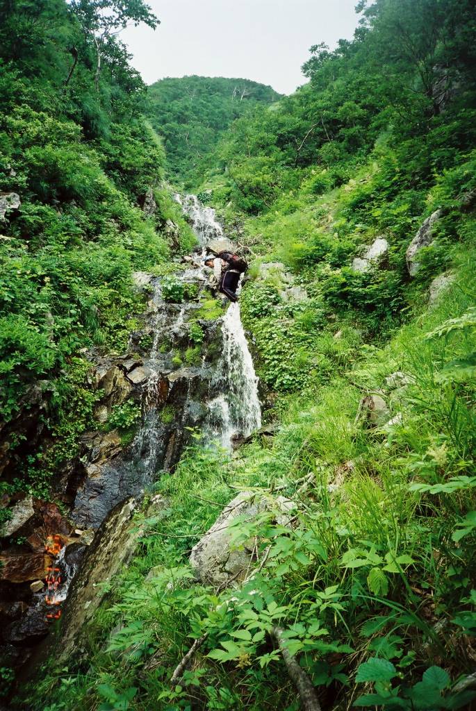ここから先は前回は来ていない。雪渓はほとんど消滅している。沢は函状になり、滝が三段になっている。1段目はサクッと直登。2,3段目はよく覚えていないが、直登したかもしれないし、巻いたかもしれない(ぉぃ。ともかく、F2,F3ほどの強烈さもなく、核心はここで終わる(Co1100)。あとは小滝群をこえ、ヤブの中に沢は消える。すぐに主稜線に上がり、さほどのヤブもなくピークに到達する。