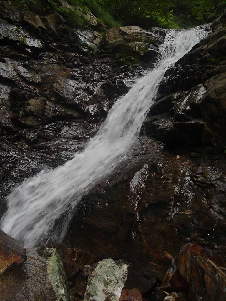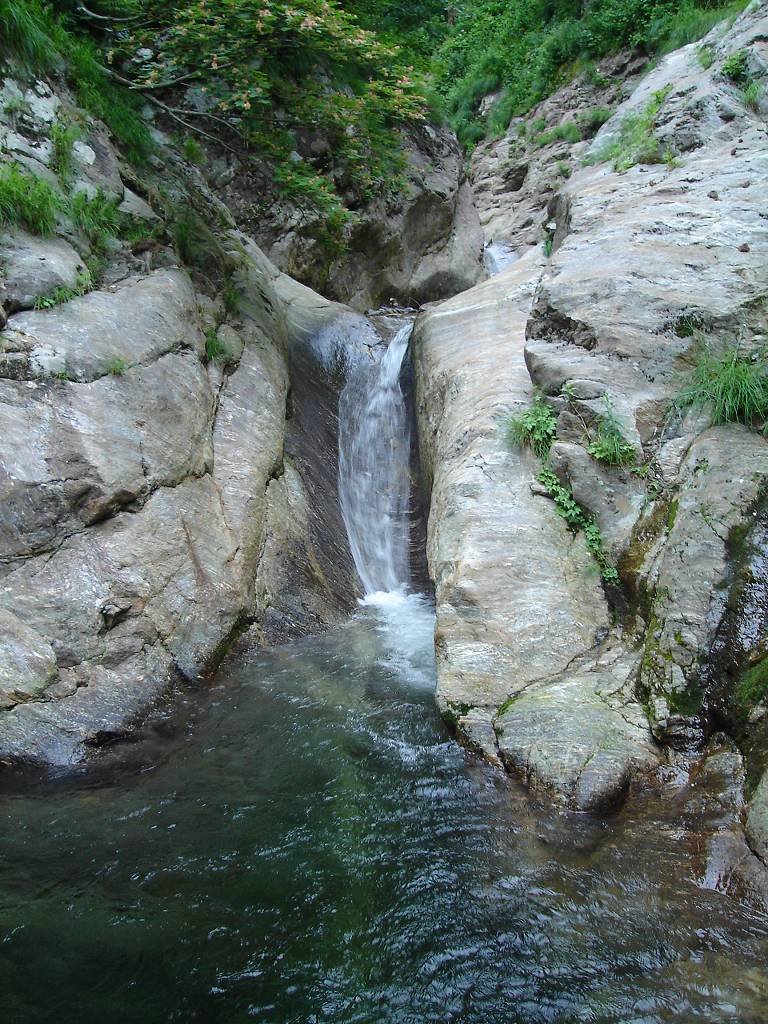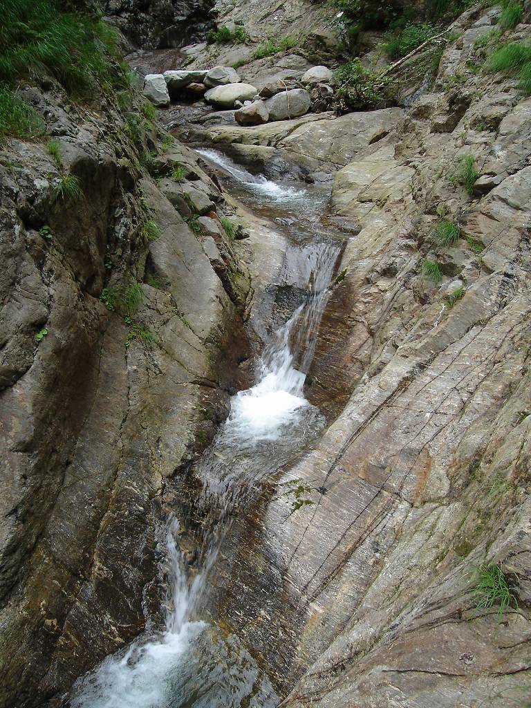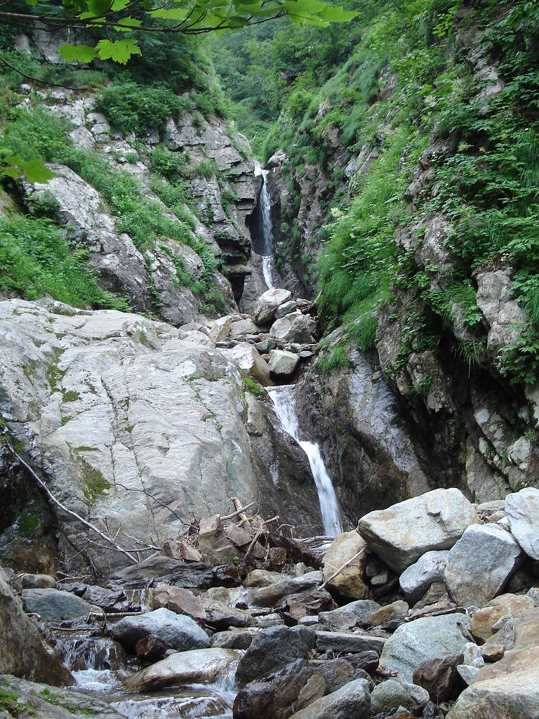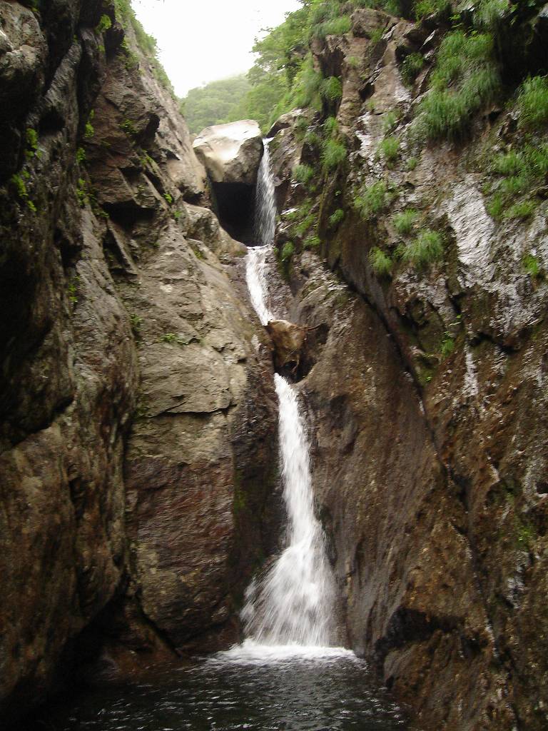 悩んだあげく、今日はアタック装備で行くことにする。空は曇り。どうもパッとしない。シュラフ等不要な装備をスタッフバッグに詰め、近くのダケカンバの枝にひっかけて出発。天場を出てもしばらくは河原が続く。 Co650 の右岸のルンゼを見てからようやく小滝が現れ始める。まずは序の口とも言える小滝を快調に直登していくと、 Co680 で両股の滝を見て徐々に険谷の片鱗を見せ始める。 Co690 の滝は左岸のバンドをつたって直登可能。この上部は真っ暗な函になって直登可能な滝がひとつかかっている。