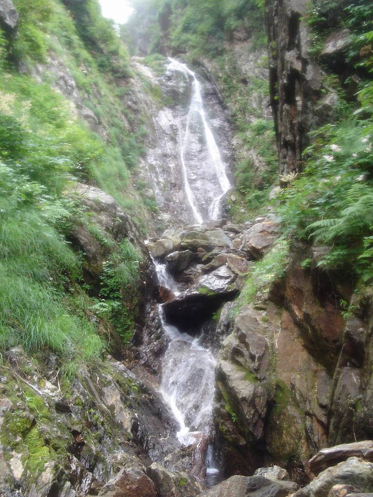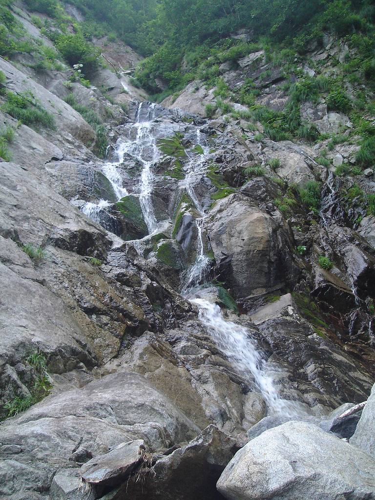 小滝を1つ2つ登り、小さな雪渓の残るガレを進むと、 Co850 の三段の大滝に出る。下の2段を簡単に登り、3段目に出る。ここは豪快にシャワーという情報を得ていたので、右岸から思い切って水流の中に飛び込んで登っていくが、途中でホールドが見あたらなくなる。おいおいそりゃないぜ。っつー事で一度クライムダウンしてしばし観察。もう一度同じ所に取り付き、途中から左手にトラバースして一部草付きをよじ登り、最終的に水流へと抜ける(Co850-880大滝)。