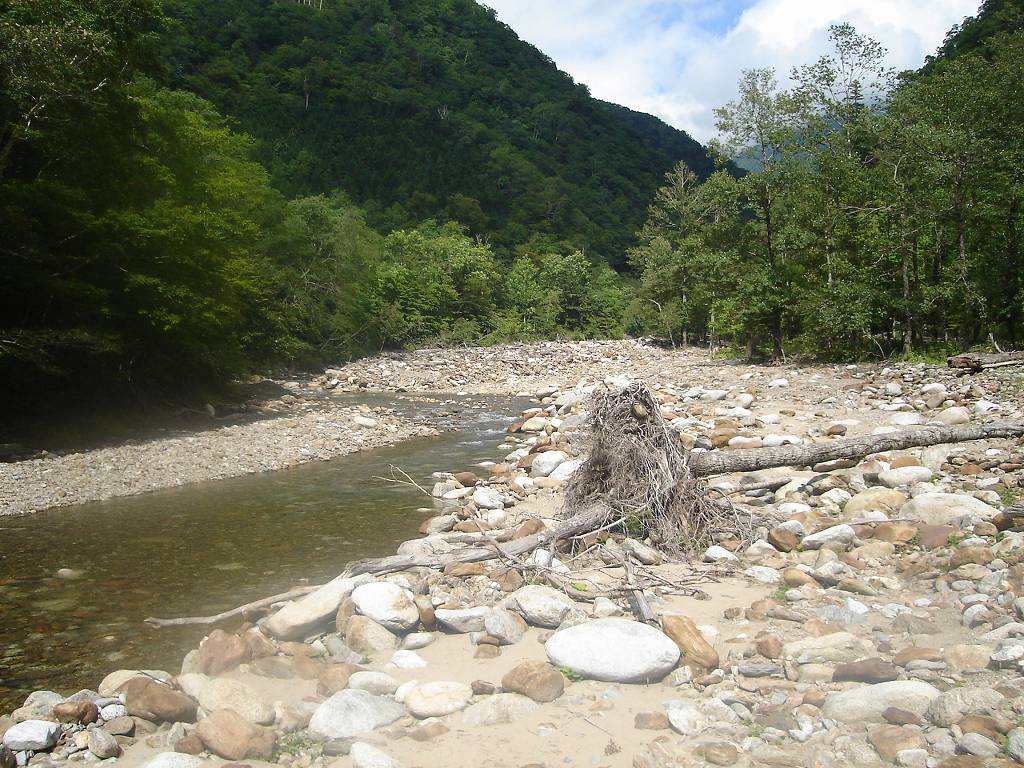 結局大部分を手押しで林道終点に到着し、自転車を残置し、入渓する。沢はひたすら河原である。直登沢に入っても河原が続き、 574三股に到着する。ソエマツ沢にはかなり釣り人も入っているようだが、この辺りはまるで魚がいそうな気配はない。時間も遅いし、今日は釣りはせずに焚き火をおこして終了。明日はピリカヌプリピークで幕営予定だが、今日の調子だと、この荷物を担いで登るのはちょっときつそうだ。アタック装備なら日帰りできるだろうか・・・