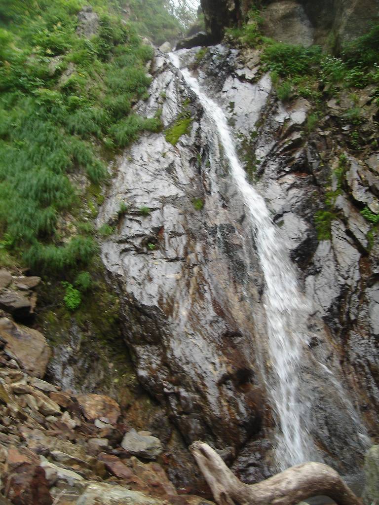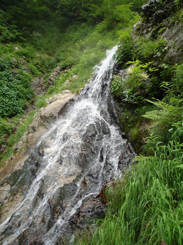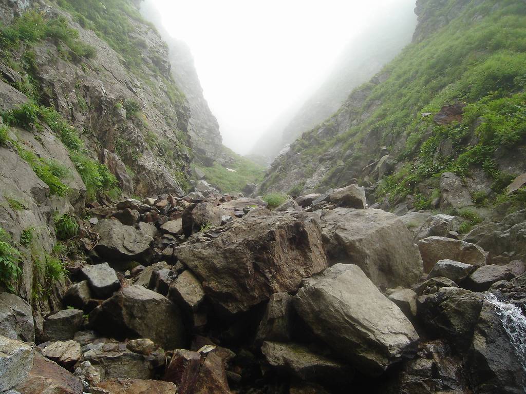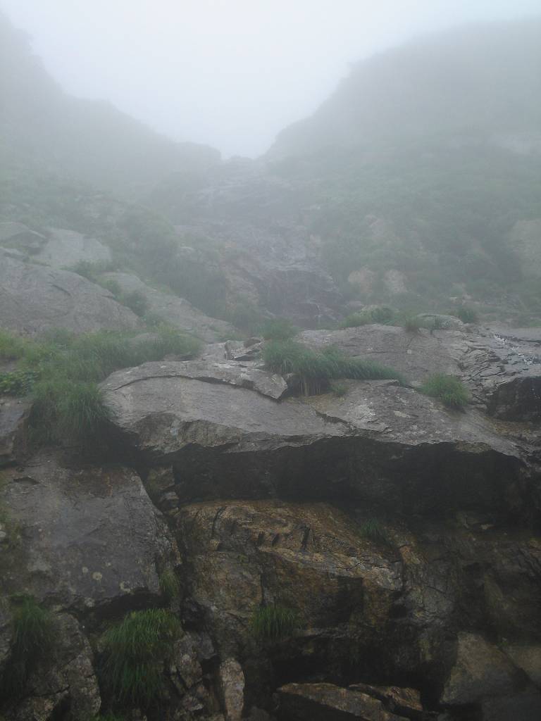 Co1240 の直登沢は右岸から水流の少ない滝となって落ちてくる岩壁で、ガスが濃いと見落とすかも知れない。この沢で最大級の滝だが、難度的には問題ない。最後の抜けはやや微妙なところもあるが、「やばさ」は感じない。あとは容易な小滝の連続する岩盤の沢となって、源頭まで続く。 Co1450 付近で水は切れ、草付きの沢形を左寄りに詰めると、 Co1570 付近で主稜線に出た。