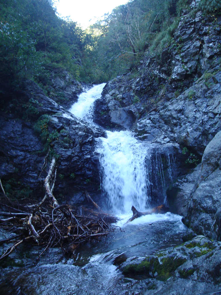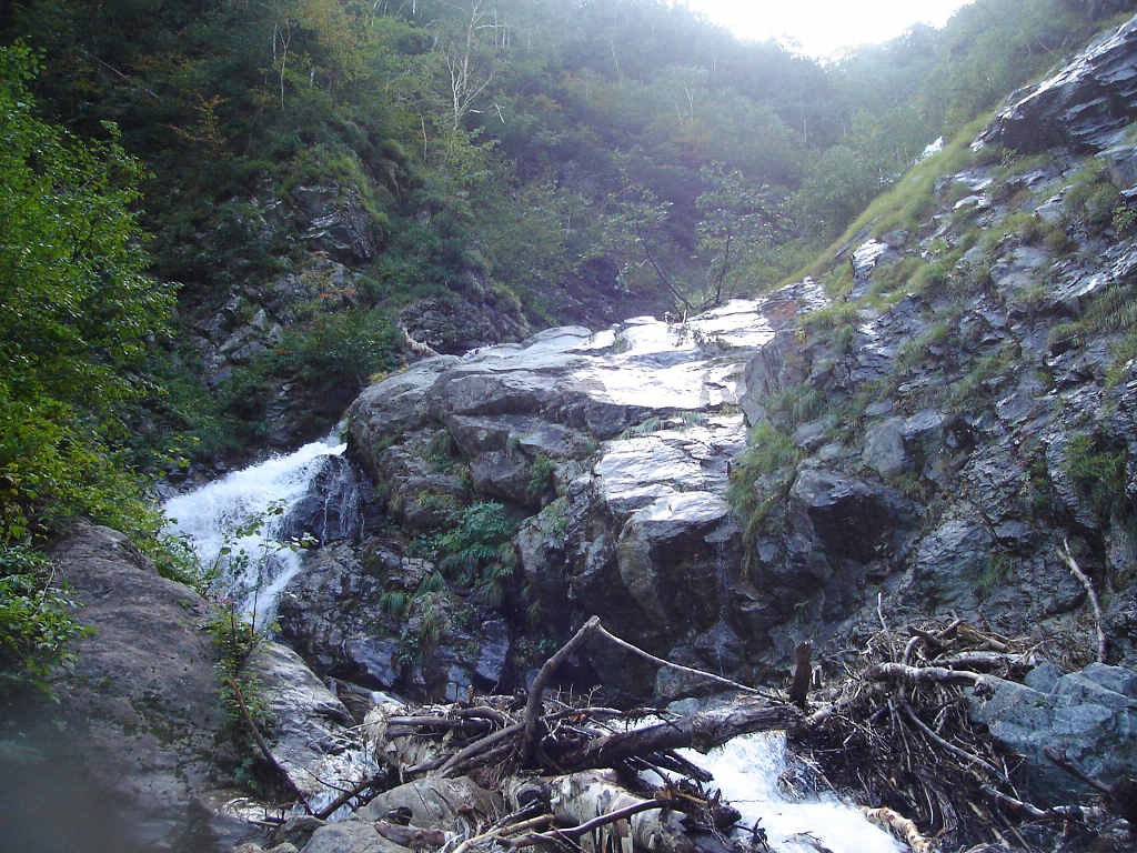二段の滝の下から、尾根筋に取り付く。急傾斜の木登りである。いつものように適当なところからトラバースしたいが、壁が立っていてなかなかトラバースに移れない。どんどんと高いところまで追いやられて、高度計を見ると、取り付きから 100m ほども高く登っていた。大滝が下の方に見えてようやくトラバースに移るが、それでも滝の右岸のルンゼに出てしまった。ついでだから、このルンゼをクライムダウンして滝の基部まで見に行こうかと思ったが、やっぱり登り返すのが面倒くさいから止めた。更にこのルンゼを傾斜が緩くなるまで詰めて、滝の上の尾根筋にでる。この尾根筋を 50m ほど下って行くと、滝の真上に出た。