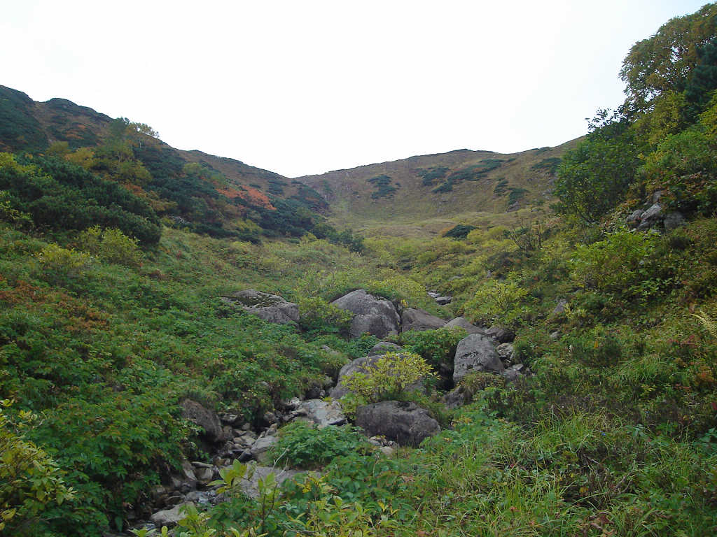 Co1470 の滝は左岸を直登してから水流に入って抜けた。すると、小さな函状巨岩帯となって、これを過ぎると一気に傾斜が緩まり、カールの様相となる。しばし小滝をいくつか越えて行き、水量の多い方へ進んで行く。地形図に忠実に、ピーク方向の沢へ向かって行くと、詰めはハイマツの藪が濃そうなので、一本戻って右の沢へ入る。