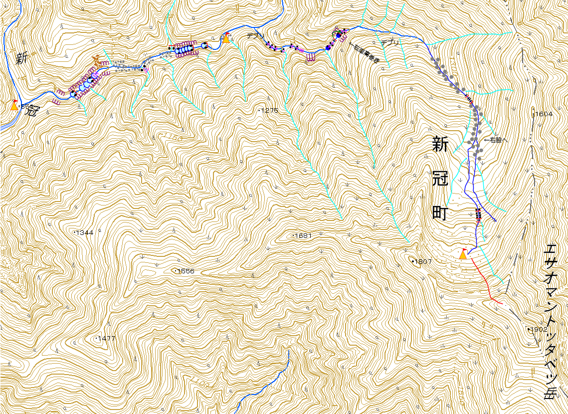 新冠川本流とは対照的な小規模な渓相である。しばらく行くとゴルジュが始まるが、特に問題なく通過出来る。すぐに歩きやすい河原となる。 Co920 から5~6段の連釜のゴルジュとなり、右岸をへつって通過する。このゴルジュから、 Co960 二股の間によい天場がある。 Co960 から 1200 付近までは、近年大規模な雪崩でもあったらしく、大量のデブリ(倒木)に埋められてる。二股を右に入るといくつかの滑滝も現れるが、問題になるのは Co1080 の滝だけである。この滝を越えると、じきにゴーロとなって水は伏流する。 Co1420 付近の涸れた二股は、左の方が深く、本流に見えるが、こちらはピーク北の主稜線上に上がる東のルンゼに突き当たってしまう。カール底に直接出るには右へ入る。灌木の覆う沢を進むと、カール底直下の連瀑帯に出る。カール底からはピーク向かって右側に見えるルンゼを詰めるとたいして藪漕ぎもなく稜線に出る。ピークまでは踏み跡がある。