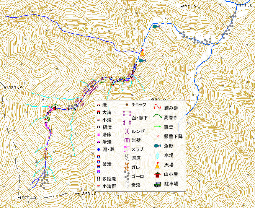 出合から始めに出てくる小さな三段の滑滝は魚止めとなっていて、小さな釜ながら大物が潜んでいる。ここから滝が断続し、いずれも直登可能で、登れなくとも簡単に高巻ける。 Co670 二股の先の Co680 の滝は右岸側壁をトラバースして高巻けるが、直登するには釜を泳いで取り付く。 Co720 のチョックストンの滝には残置シュリンゲが懸かっている。 Co810 二股は正面の枝沢が滝となって合流しているが、巨岩が積み重なった右股が本流だ。 Co950 の樋状の滝は簡単に高巻けるが、天気のいい日にはシャワークライムを楽しみたい。 Co960 の大きな滑滝を登ると、美しい滑床の続く癒し系の渓相となる。水が涸れて伏流となって、 Co1150 を過ぎたら左手に見えるロックガーデンに上がると、ヤブ漕ぎ無く中間コルの少し本峰寄りに出る。本峰までは踏み跡が付いている。