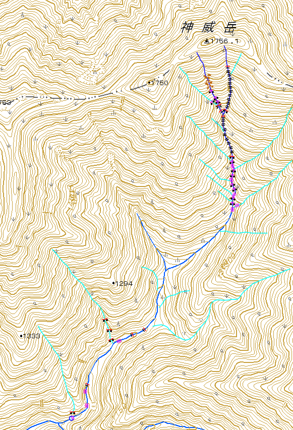 出合から荒れ気味で、灌木に覆われるところもあるブタ沢である。 Co1220 からは容易な小滝滑滝が出始め、 Co1450 二股まで延々と続いている。二股を左に入ると、ガレ沢となって最後は急な草付きを詰めてピーク西の稜線に出る。一方右に入ると引き続き滝となって岩盤が Co1650 付近まで続いている。沢形はすぐに消えてハイマツの海を漕いでピーク東の稜線に出る(⌒ン⌒)。