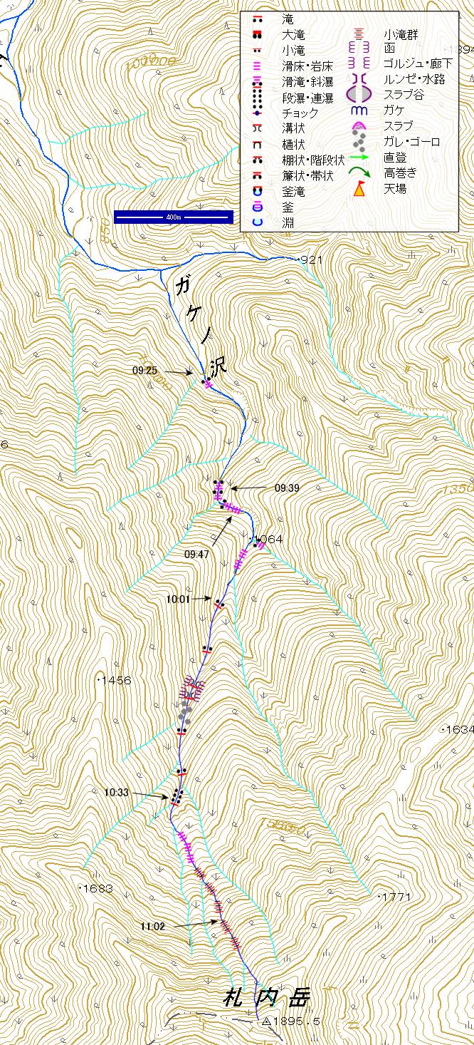エサオマン林道跡の踏み跡からエサオマントッタベツ川に入渓して50mほど行くとガケノ沢出合となる。 Co840 を右に入ってしばらく行くまではゴーロが続く。 Co890 付近で F1 が現れる。 Co960 付近から滑滝が連続するようになる。 Co1150 付近からルンゼ状の岩盤の沢となるが、難しい滝はなく、ほとんどが直登可能だ。このあたりは時期によっては不安定な雪渓が沢を埋め、処理が困難になる事がある。 Co1500 を過ぎると涸れた岩盤となり、ヤブ漕ぎもなくピークに突き上げる。雪渓さえなければ、特に困難なところも無く、快適な沢である(⌒ン⌒)。