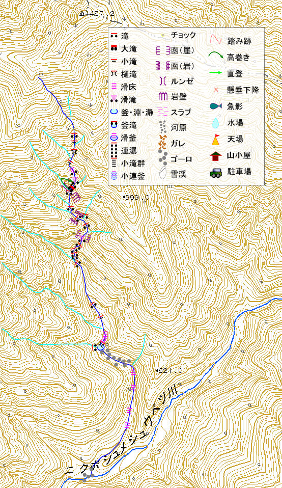 下流域はおおむねゴーロの沢で、小滝や滑床が断続する。 Co650 の大きな二段の滝を皮切りに滝が連続するが、特に難しくはなく快適に直登していける。 Co850 の大滝がこの沢の核心である。直登するにはそれなりの準備が必要で、高巻くにも簡単ではない。 Co1050 付近からは藪のトンネルとなるが、沢筋は稜線近くまである。東尾根分岐からは北側に明瞭なシカ道が続いており、ピークまではすぐだ(⌒∀⌒)。