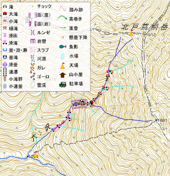 出合からしばらくは単調な河原である。 Co1150 を過ぎたあたりから滝が出始めるが、小振りなもので問題にはならない。 Co1290 から 1370 まで、函状の中に滝が連続しているがそれほど難しいものではない。続く大滝を過ぎると、極端に水量の少ない沢となる。 Co1700 付近で絶壁に囲まれると、沢筋はハイマツの藪に覆われている。コンパスを頼りに沢筋を探し出し、北戸蔦別岳東のコルに出る( ̄へ ̄)。